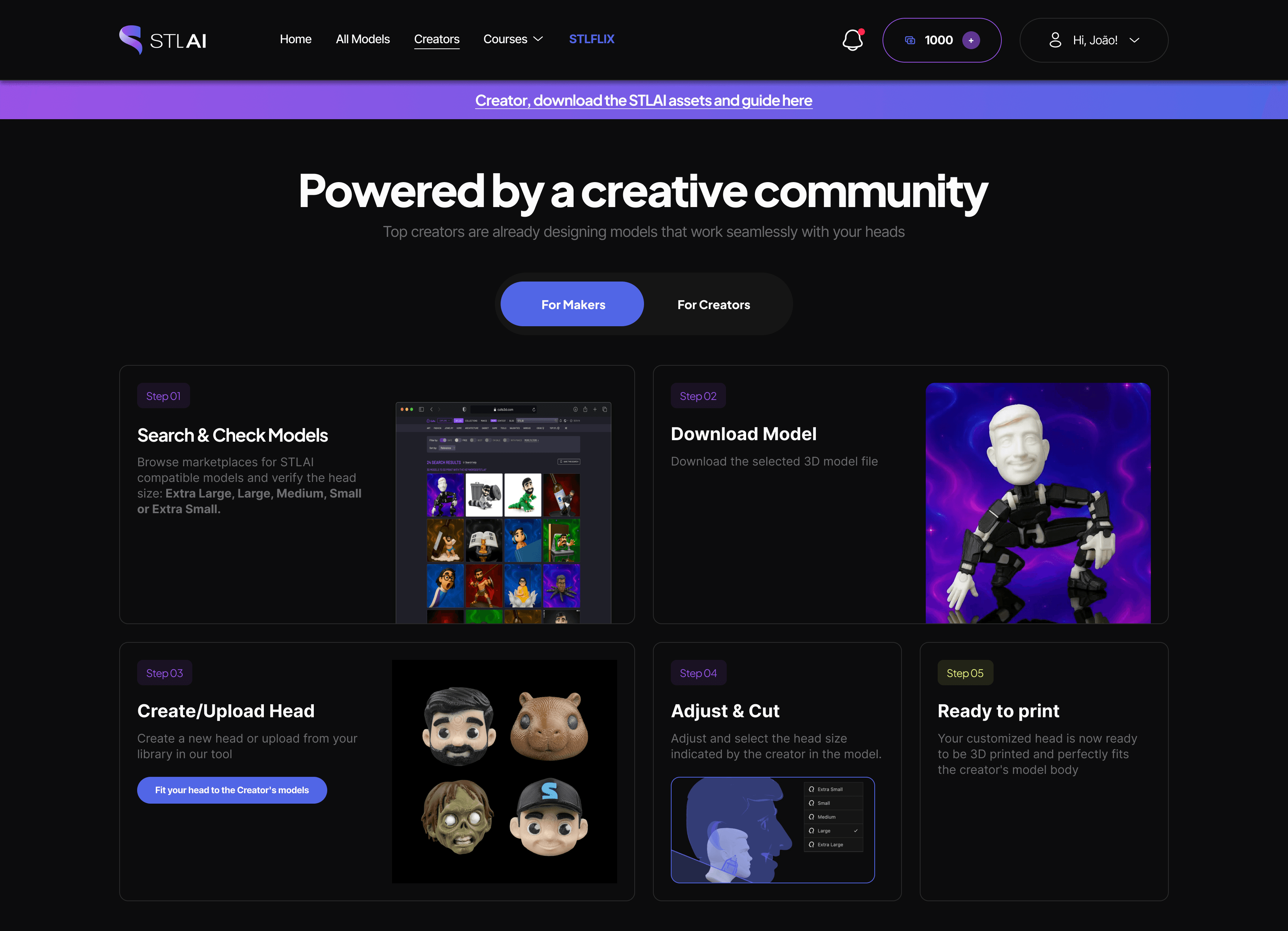 A STLAI é um produto de geração de modelos 3D personalizados utilizando AI. A UI e UX da plataforma foram pensadas inteiramente por mim durante 4-5 meses até o lançamento.